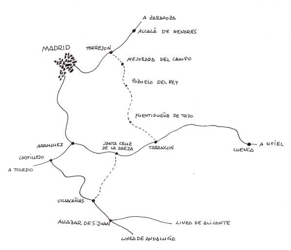 There are two ways to get to the start of the 40 Day Train Greenway, developed by the Autonomous Community of Madrid. One on foot, by bike, or by wheelchair from the Tajuña Greenway, which forms a continuation of the 40 Day Train Greenway (together they total 63 kilometres). The other way to arrive is from Carabaña, a rural town famous for its medicinal waters. Beside the M 204 road you can still see the remains of the various facilities that grew up around the saline springs: the baths, the bottling plant (now a youth hostel), and the attractive Chávarri electricity plant built on what was once a flour mill. As we leave Carabaña, about 200 m from the town centre the road which goes to Estremera crosses the river Tajuña over a historic 16th century bridge and, immediately afterwards, also crosses the Tajuña Greenway. We join this Greenway (on our left) and 300 m further on the red tarmac identifying the trail divides. The left hand lane, belonging to the Tajuña Greenway, continues to make its way through the Tajuña river lowlands as far as Ambite, while the right hand lane, part of the 40 Day Train Greenway, starts to climb. Halfway up, the trail turns sharply to the right and joins the original route of the 40 Day Railway.